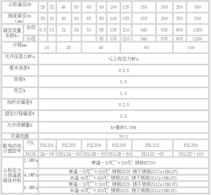 七、電動(dòng)雙座調(diào)節(jié)閥 規(guī)格參數(shù)表: