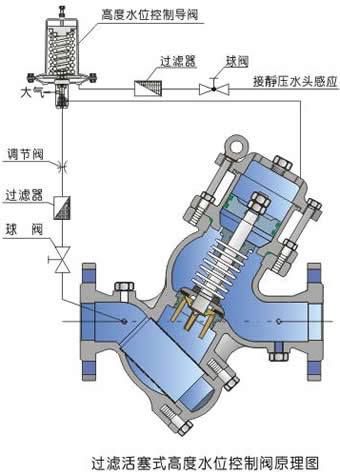 本閥利用水箱(水塔)設(shè)定的高低水位的靜壓水頭之差,通過水位高度導(dǎo)閥來控制主閥敏感元件活塞的上下運(yùn)動(dòng)以達(dá)到主閥的啟閥。當(dāng)水箱的水位升到設(shè)定的高水位時(shí),主閥關(guān)閉,停止向水箱供水;當(dāng)水箱下降到低水位時(shí),主閥打開,向水箱供水。通過調(diào)節(jié)高度水位導(dǎo)閥的調(diào)節(jié)螺桿,可以設(shè)定高低水位。