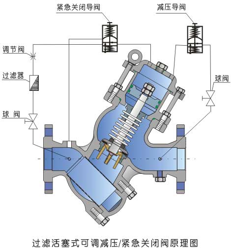 在現(xiàn)代的工業(yè)民用建筑中,各種新型的給水系統(tǒng)和消防系統(tǒng)不斷出現(xiàn),因而對閥門的性能要求也就越來越高,越來越多.本閥是針對現(xiàn)代樓宇而設(shè)計的新型閥門,它既具有可調(diào)減壓的功能,而又可在上游設(shè)定某一壓力點,當壓力超過這個設(shè)定的壓力點時本閥緊急關(guān)閉,達到設(shè)計要求.