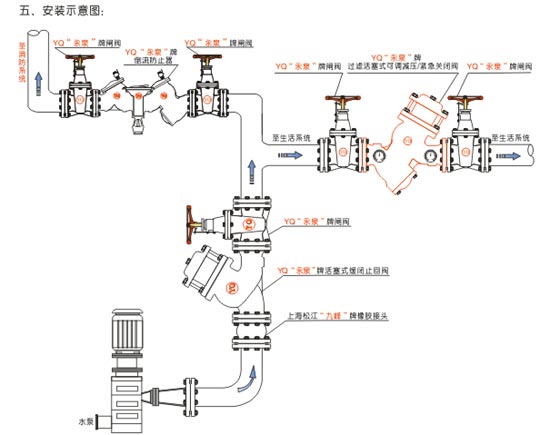 本閥用于生活與消防系統(tǒng)共用的供水系統(tǒng)中,當消防系統(tǒng)開啟時壓力升高,本閥關(guān)閉、切斷生活用水,確保消防用水.