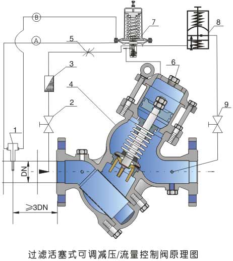1.畢托管 2.球閥 3.過濾器 4.主閥 5.針閥 6.開度指示器 7.限流導閥 8.減壓導閥 9.球閥