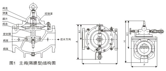 水力控制閥分隔膜型和活塞型兩類,工作原理相同,都是以上下游壓力差△P為動力,由導閥控制,使隔膜(活塞)液壓式差動操作,完全由水力自動調節(jié),從而使主閥閥盤完全開啟或完全關閉或處于調節(jié)狀態(tài)。當進入隔膜(活塞)上方控制室內的壓力水被排到大氣或下游低壓區(qū)時,作用在閥盤底部和隔膜下方的壓力值就大于上方的壓力值,所以將主閥閥盤推到完全開啟的位置;當進入隔膜(活塞)上方控制室的壓力水不能排到大氣或下游低壓區(qū)時,作用在隔膜(活塞)上方的壓力值就大于下方的壓力值,所以就會把主閥閥盤壓到完全關閉的位置;當隔膜(活塞)上方控制室內的壓力值處于入口壓力與出口壓力中間時,主閥閥盤就處于調節(jié)狀態(tài),其調節(jié)位置取決于導管系統(tǒng)中的針閥和可調導閥的聯(lián)合控制作用。可調導閥可以通過下游的出口壓力并隨它的變化而開大或關小其自身的小閥口,從而改變隔膜(活塞)上方控制室的壓力值,控制主閥閥盤的調節(jié)位置。